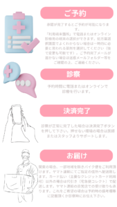 - A問診票をご入力していただき、オンラインによる簡単な診察があります。